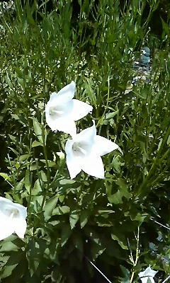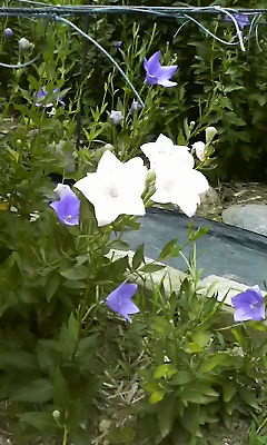 私達が見慣れている星の形の桔梗は「五月雨」という品種なんですが、他にも丸みを帯びた花弁が特徴で一円玉くらいの大きさの「糸桔梗」、花弁が二重になっている桔梗、花弁が開かず蕾上の「小町桔梗」、…、など割と種類が多いんですね。あと、花の色も、写真は白と青紫の色ですが、薄い桃色や薄赤紫、白地に細かな青い斑点のものなどがありましたよー。